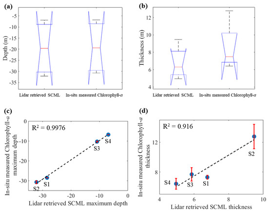 Statistical hypothesis testing and correlation analysis is applied for correlation detection of the maximum depth and thickness of Lidar-retrieved SCML with in situ-measured Chlorophyll-a profile. The statistical hypothesis testing result of maximum depth is shown in Table 1 and the result of layer thickness is shown in Table 2. p value refers to the probability of difference between the two groups of data; generally, a p value less than 0.05 indicates that there is difference between the data groups. The p value of maximum depth in Table 1 is 0.9751, and the p value of thickness in Table 2 is 0.3456, which means there is less difference between the maximum depth and thickness of airborne lidar-retrieved SCML and shipborne in situ measurement data. Figure 6 is the result of statistical analysis and correlation analysis of Lidar-retrieved SCML and in situ-measured Chlorophyll-a. In Figure 6a, the data dispersion of the two groups of data is similar and the error of S2 station is the largest. The absolute difference of layer maximum depth between lidar data and in situ data for all stations is less than 0.75 m. The lower boundary of Lidar-retrieved SCML is 1.44 m deeper than that of in situ-measured data, which is Å32.14 m and −30.70 m, respectively. In Figure 6b, there is a slight difference in the dispersion of the two sets of data. The thickness of in situ-measured Chlorophyll-a is thicker than that of lidar-retrieved SCML. The mean absolute difference of layer thickness difference between lidar data and in situ data is about 1.74 m. The layer thickness difference of the S2 station is the largest, with a difference of 3.30 m, and the smallest is the S1 station, with a difference of 0.53 m. Figure 6c,d is the result of correlation analysis, showing that data of Lidar-retrieved SCML and in situ measurement are highly correlated. The R2 of maximum depth is 0.9976 and the R2 of thickness is 0.916, respectively. The algorithm tends to underestimate the thickness of the layer; it maybe due to that the initial estimation of the lidar background signal is biased to higher values of β and α than actually exist by the presence of the subsurface layer, resulting in some of the signal contribution of the subsurface layer being subtracted out as “background”. An improved method to synthesize polarization information may be helpful for reducing the underestimation for layer thickness in the future.