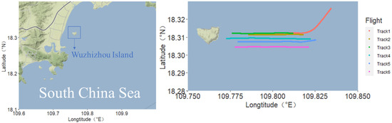 Lidar flight tracks near Wuzhizhou Island. The six colors correspond to six tracks: the pink line is track 1, the gold line is track 2, the green line is track 3, the light blue line is track 4, the dark blue line is track 5, and the magenta line is track 6, respectively.