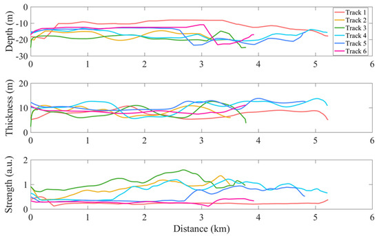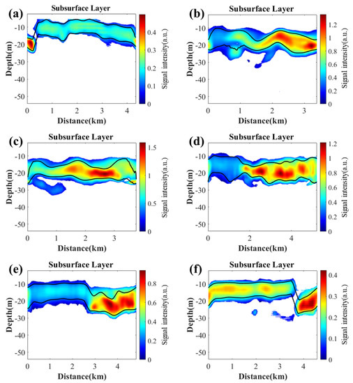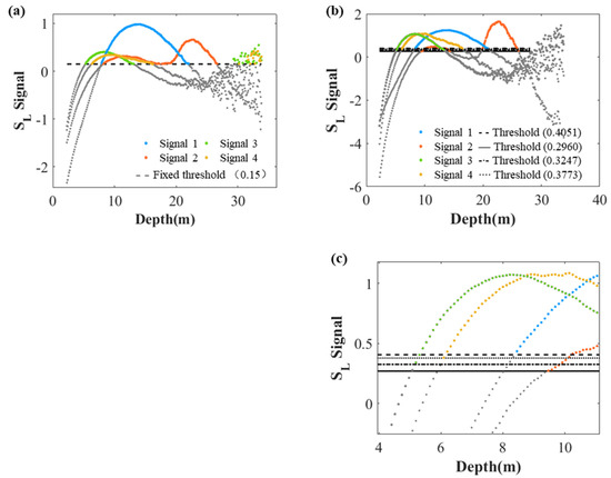 In the past, a preproposed fixed threshold was set for subsurface extraction; however, the choice of threshold is arbitrary or empirical. As shown in Figure 10, four signals are selected to illustrate the difference between the results using a fixed threshold and the dynamic threshold. Figure 10a shows the calculation result of the fixed threshold (set as 0.15). It can be seen clearly that each signal has different signal characteristics, such as signal 3 and 4 which raised after the depth of 25 m. Although the subsurface signal can be obtained by simply subtracting 0.15, there are some redundant noise signals. These noise signals may come from seabed and the vertical slice as shown in Figure 3c. If these signals are not removed, they will affect the subsequent calculation of depth and thickness and in the past studies, they are delated artificially. Figure 10b shows the dynamic threshold of 4 signals and Figure 10c is an enlarged part of Figure 10b in order to see more clearly. The dynamic threshold is calculated based on the characteristic and change trend of each signal. For signal 3 and signal 4, the raised part at depth of 30 m is considered as noise and is denoised so that the accuracy of subsurface extraction is improved.