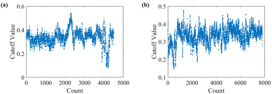 It should be noted that the fixed threshold cannot compared with dynamic threshold directly, because the fixed threshold is a simple value set as threshold, dynamic threshold is a converted value. It is calculated based on standardized observations (Equation (7)). , which is also called cutoff value in Equation (8), is the dynamic threshold that changes according to the location estimator and value estimator of each group of signals. In order to facilitate the calculation, the judgment threshold is defined as the result of subtracting the cutoff value from the standardized observation (Equation (8)). Then, when is greater than zero, the corresponding signal is the subsurface signal.