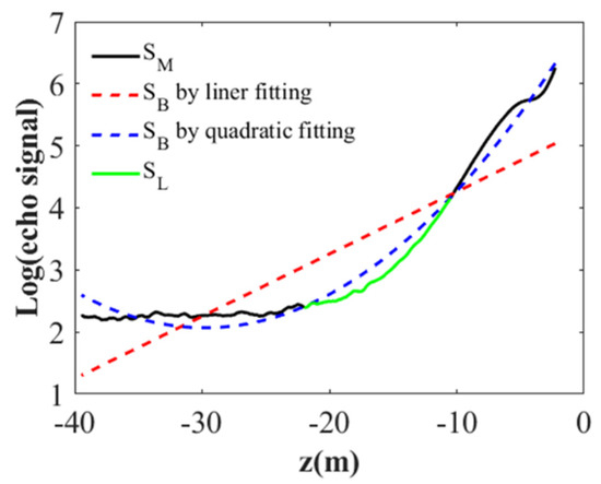 The original echo contains kinds of noises such as background noise, random noise, and noise of the lidar system itself. It is necessary to remove noise from the original echo data to obtain echo data with a high signal-to-noise ratio (SNR). The average of the last one hundred pulse samples is considered as background noise signal and is subtracted. The noise-subtracted signal is logarithmically converted to obtain the lidar pre-processed signal SM. Then, the depth-dependent background scattering signal SB can be estimated as an exponential regression and be obtained from a linear function of depth z (Equation (2)).