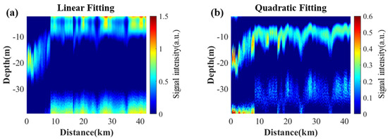 The comparision of results based on the linear fitting and quadratic fitting is shown in Figure 14. Figure 14a is the result of subtracting the SB calculated by the linear fitting method from the original lidar data. At the distance of 0 to 10 km, there are obvious SLS at the depth of 20 m, but at the distance of 10 to 40 km, the signal above 10 m is connected to sea surface signal, and is incoherent with the previous signal. Meanwhile, signals appear below 30 m. This means that the liner fitting method is invalid. As an alternative, the quadratic fitting method is used to calculate SB and the result is shown in Figure 14b. After subtracting SB from original signal by Equation (4), a continuous banded subsurface layer signal is obtained. At first, the signal was located at 18 m and decreased slightly, then raised from 20 m to 10 m, and finally remained at 10 m. This change may be affected by wind-driven upwelling events.