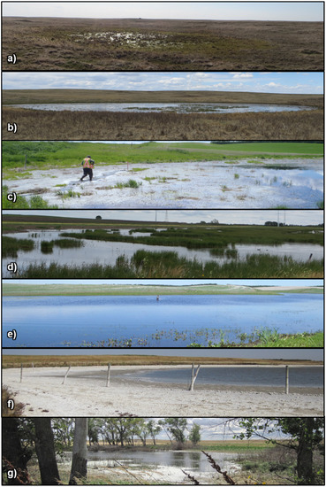 Various wetland types found in the prairie pothole region: (a) ephemeral marsh in spring with shallow surface water immediately following precipitation; (b) temporary marsh with shallow surface water following snowmelt; (c) seasonal marsh showing emergent and established riparian graminoid vegetation; (d) semi-permanent marsh with dense emergent vegetation in a deep marsh zone; (e) permanent shallow open water wetland with a permanent open water zone and peripheral emergent and floating marsh zones; (f) intermittent alkaline shallow open water wetland showing seasonal drawdown exposing alkali zones; (g) treed swamp with a shallow emergent zone surrounded by tall woody vegetation (more common in the northern regions of the PPR). Photo Credits: Joshua Montgomery.