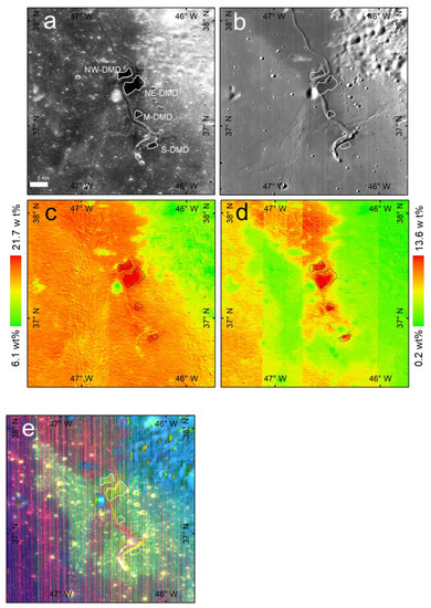 Three abnormal patches are distributed along the southern end of Rima Mairan (Figure 2). They are obvious in the CE-2 DOM image (0.45~0.52 μm) and the M3 2.49 μm band, which show that their overall albedo is significantly lower than the surrounding material. The MI-derived titanium and iron content map shows that the TiO2 and FeO contents in these three patches, which are ~5–10.5 wt% and ~18–20 wt%, respectively, are higher than concentrations of the surrounding substances. The M3 IBD image shows a yellow-green color; This is different from the orange-red to purple Eratosthenian basalts, yellow Imbrian basalts, and the blue highland material, indicating a different mineral composition. The boundary of these features is relatively fuzzy, but based on multiple data, we have drawn rough boundaries. From north to south, we refer to these boundaries as N-DMD, M-DMD, and S-DMD (Figure 2a). All three DMDs are located next to Rima Mairan. N-DMD is cut by Rima Mairan and is divided into two parts: NE-DMD and NW-DMD. Among the DMDs, NE-DMD is the largest and displays the most distinct characteristics in multiple remote sensing data.