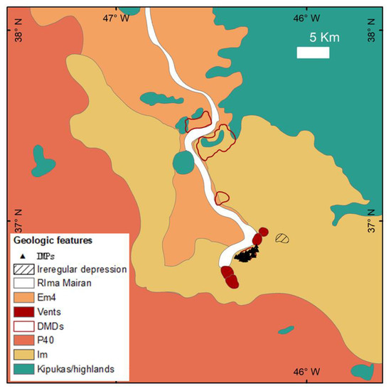 Previous studies on IMPs suggest that they may have different formation mechanisms. This study found that some IMPs are located on S-DMD, while some IMPs are outside the area of S-DMD. This suggests that the formation of IMPs due to DMDs [28] may not be reasonable. From the spatial distribution, IMPs are close to the volcanic vents SV3 and SV4, and they are more likely to have formed as a result of very vesicular lava eruptions emplacing them under the cooling surfaces of the lava lakes near the vents during the very last stage of local volcanism [29,30,31]. This phenomenon indicates that there might have been a lot of gas-rich volcanic events in the Rima Marian source area during the waning stage.