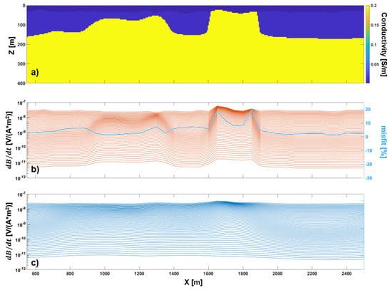 Comparison of the 3D and 1D responses for the conductivity model of Test 2: (a) Vertical section of the 3D conductivity model in Figure 9a (it is a portion of the section in Figure 9b); (b) 1D responses calculated for the 1D portions of the original model in Figure 9a at the locations of the ATEM soundings (red dots in Figure 9b)–the blue line represents sounding-by-sounding, the relative misfit between the 1D and 3D responses (the corresponding axis is on the right in blue); (c) 3D responses measured at the same location in panel (b), but, here, calculated for the entire 3D conductivity model (Figure 9a).