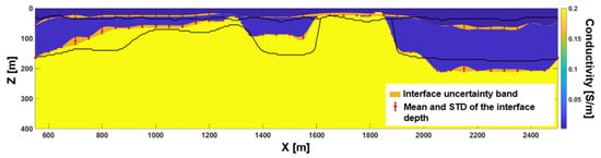 If instead, we use a subset of the 3D prior samples (Figure 4) to calculate their actual 3D responses and compare them with the data calculated, this time, by means of the 1D forward modeling applied to the 1D conductivity vertical profile in the center of each selected prior realization, we can estimate the appropriate mean and covariance , and incorporate them into the 1D stochastic inversion scheme. The results of the application of this new scheme to Test 1 is shown in Figure 6. Now, the result almost perfectly matches the true model. When the mean depth of the interfaces does not fit the true conductivity change—for example, near the steep lateral variations around 1000 m and 1400 m—the correct location of the boundaries still lies within the uncertainty bands.
