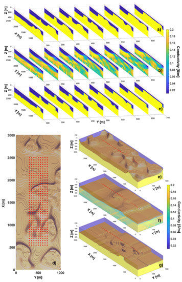 Since we are dealing with 3D conductivity models, it is probably more appropriate to visualize the consequences of the different inversion schemes over several flight lines (Figure 7) across the Test 1 model. If we examine Figure 7b,c, the same conclusions drawn for an individual vertical section are clearly valid also for the other acquisition lines (and, consistently, also for the lateral intra-line resolution—kindly, compare Figure 7e,g).