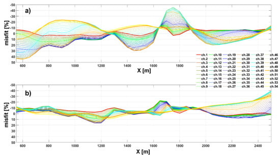 Comparison of the percentage misfit between the observed 3D responses and those calculated from: (a) The 3D conductivity model retrieved by the 1D deterministic approach (Figure 7b,f); (b) The 3D conductivity model obtained via the stochastic inversion accounting for the modeling error (Figure 7c,g). Each of the 54 plotted time-gates (channels) is depicted with a different color.