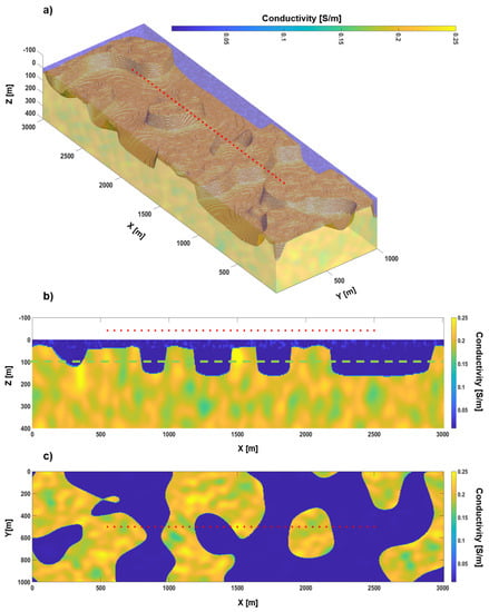 Conductivity distribution for Test 2: (a) 3D view of the model consisting of a sequence of three heterogeneous layers with varying thicknesses; (b) Vertical section of the model in panel (a), along the survey line highlighted by the red dots indicating the locations of the ATEM soundings; (c) Plain view at 100 m depth (dash green line in panel (b)).