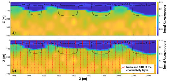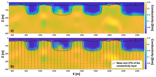 Also for this more complex test, a 1D stochastic inversion can be performed by following the previously discussed Metropolis approach, making use of precalculated samples. The 105 realizations of the prior distribution are very similar to those shown in Figure 4 for Test 1; the only difference is that, consistently with the new model to be reconstructed, also for the prior realizations, the conductivity of each layer is allowed to vary. Figure 12 shows the mean map of the posterior distribution obtained without taking into consideration the modeling error; as for Figure 5 (about Test 1), also for Test 2, the retrieved mean model (Figure 12a) does not capture the lateral variation of the top of the deepest layer and smooths the large majority of the incisions out. Perhaps worse than that is the fact that, as shown by the standard deviations of the conductivity of each layer (plotted in Figure 12b), the leveled-out reconstruction is given for (almost) undeniable.