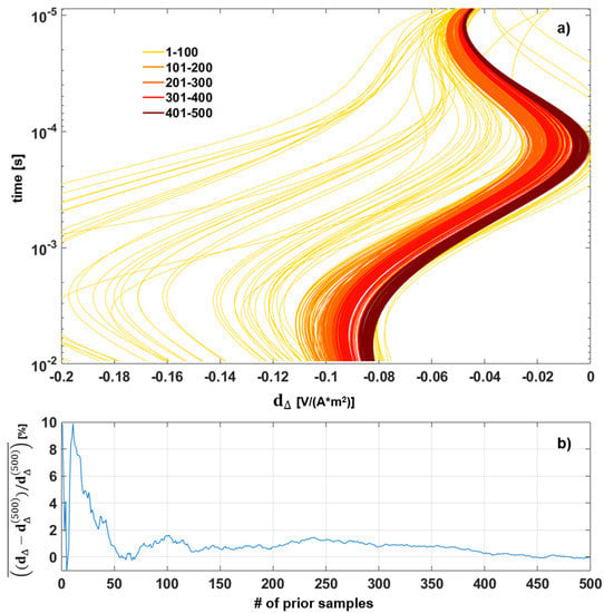 Still considering Test 1’s dataset, we try to set up a strategy for the evaluation of the minimum number of realizations of the prior to be considered for an effective assessment of the modeling error. For all the tests performed in the present research, a maximum number of 500 models (similar to those in Figure 4) have been used to calculate the difference and, in turn, the parameters defining the Gaussian probability density describing the modeling error. If we consider the behavior of the mean vector calculated for an increasing number of samples number , we can plot the results as in Figure 16a; from that figure, it appears evident that the assessment of reaches significant stability after considering a few hundred realizations of the prior.