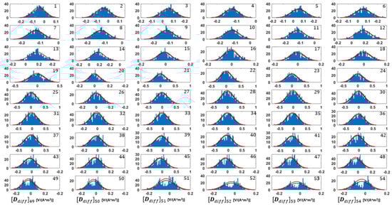 As mentioned before, the proposed approach is based on the assumption that the modeling error is actually Gaussian. In this section, we demonstrate that this working hypothesis is largely met. In this respect, each subpanel of Figure 18 shows one of the 54 histograms (one for each time-gate) of the corresponding component of the vector of the difference between the 3D and 1D responses calculated for the 500 realizations used for the modeling error assessment. In particular, the red lines represent the Gaussian that is better fitting the experimental histograms, whereas the black lines show the Gaussian profile as inferred from the distribution . It is worth noticing the excellent agreement between the black and red curves, but, more than that, the fact that for the large majority of the time-gates the modeling error is indeed compatible with Gaussian distributions. Surprisingly, the histograms for the late channels (in particular those for going from ~49 to 54—i.e., basically the last row of Figure 18) show some sort of bimodal behavior whose possible justification is not evident. A possible reason might be connected with the finite size of the 3D simulation domain. However, this highly hypothetical guess will need to be investigated and verified.