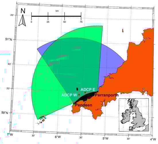 Map showing the locations of the HF radars at Pendeen and Perranporth and their coverage. The red squares represent ADCP west and east. The rectangle represents the WaveHub test site.