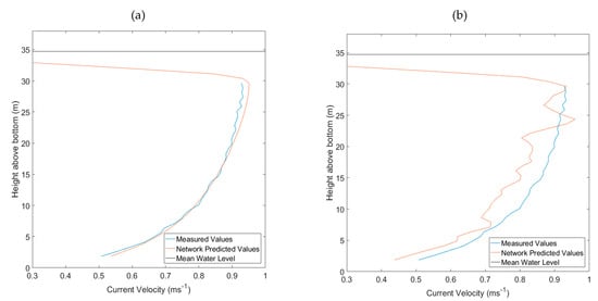 Several behaviours of the network were noted throughout the analysis. The network attempted to predict the upper 10% of the water column (Figure 4a and Figure 5b), even though the data were removed from its training data. It is impossible to confirm if the network’s predictions for this region are correct. However, some suspicions may be discussed. The upper 10% looks to be well predicted at low tides due to the continuation of the lower currents to the surface, whereas at high tide, the velocities unrealistically approach 0 ms−1. It appears the network tries to draw from any values in a depth bin, so as the low waters are more often submerged and below the 10% threshold, there is more for the ANN to learn from. At depth bins always in air or the threshold, the network can only predict 0 ms−1, and heights which are mostly in the upper 10% are inaccurate due to limited data.