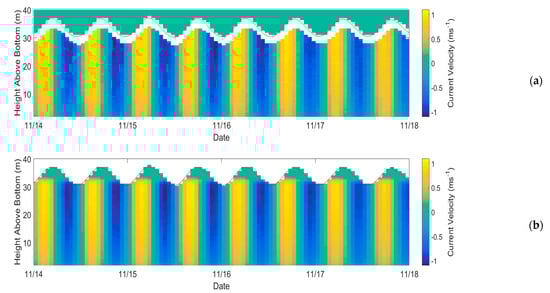 Along with the above small-magnitude long-period bias, some short but pronounced errors also exist. Where they occur, they are present throughout the entire water column, identifiable as distinct bars, a different colour to their surroundings. The network predicts the time series of each depth bin independently [41], not considering the relationship between the present bin and those above and below. Therefore, as the network learns the recurring features of each depth time series, it is unlikely to make the same error independently at each bin. The resulting implication is that errors between predictions and the measured values are caused by abnormal surface currents during training, causing the network to predict accordingly, or abnormal ADCP measurements in the testing data.
