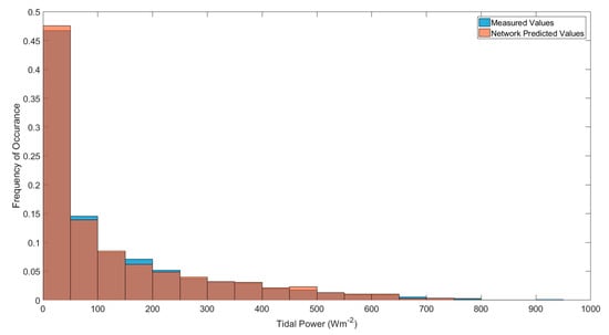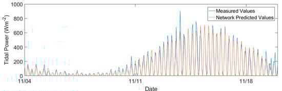 Figure 7 shows a short period of measured, and network predicted powers. The network appeared to underpredict some of the largest, abnormal peaks but overpredicted the medium-sized peaks. This pattern of predictions resulted in a mean power difference of only 0.51 Wm−2 over the 3.5 months. The inclusion of the cosine response showed that the tides have a very high angular fidelity, showing only 0.58 Wm−2 decrease in power. The power–frequency plot (Figure 8) shows high similarity between network and measured values, showing that using the network predicted or measured values may have little impact on power prediction.