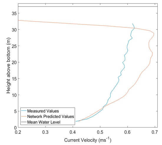 Using the BR function, it is obvious from the velocity profile that there is a greater overprediction bias at 22–29 m above the bottom (ME = 0.0168 ms−1) than from the seabed to 22 m (ME = 0.0052 ms−1) (Figure 3a). The likely reason for this is the occurrence of a weather system approaching from the southwest in the first half of the two-week training period [46], the south-westerly winds (with some gusts up to 100 km h−1) would have accelerated the surface currents during flood tide and reduced the surface velocity during ebb tide, while as the distance from the surface increases, the effects from the wind diminish. The network learns this to be normal. This hypothesis can be complemented by plotting the mean spring ebb current profile predicted by the network (Figure 10). The underprediction of the surface currents nearest to the surface suggests that the abnormally strong south-westerly wind could be slowing the ebb surface current.