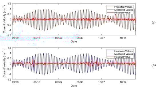 While the ANN provides a simple way of predicting semi-diurnal tidal velocities at a site without determining the harmonic parameters, non-tidal induced off-nominal currents during training would cause the network to apply assumptions made from these to the test data where the same currents may not occur, while unique currents during testing will not be acknowledged. In comparison, harmonic analysis does not acknowledge any non-tidal currents. A total of 38 constituents were considered including the shallow water M10 constituent, and the analysis was carried out on each vector component separately by least squares fitting using the T_tide Matlab toolbox as described by Pawlowicz et al. [55]. In Figure 11, the extracted harmonic constituents were used to plot tidal velocities, in comparison to the ADCP, to which the network was also compared. The residual signal between the two was also plotted, showing the difference between the harmonic prediction and the real measurements.