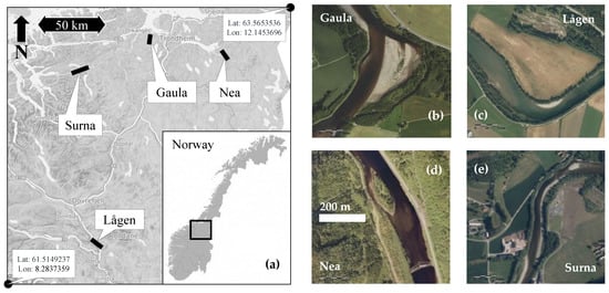 Overview of the study areas: (a) regional locations of the four rivers in central Norway; (b–e) aerial images of the river sections used as training data for cross-sectional image pixel and in-situ depth extraction. The scale for all river sections is given in (d). Aerial images by © Kartverket and Geovekst.