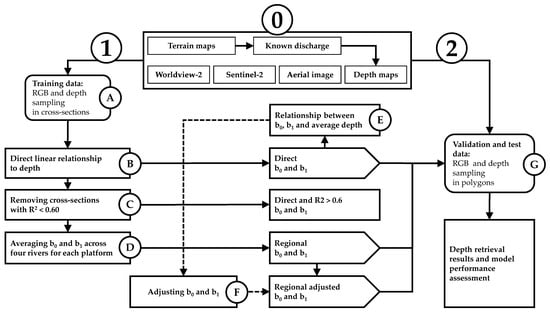 The study framework. Starting with the top box (0) displaying the study input data, the data analysis takes two pathways: (1) using RGB pixel values in river cross-sections to set up the different relationships between depth and image pixel quantities in steps A through F, and (2) testing and validating former relationships in a validation polygon in step G.