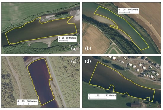 Validation polygons for the model quality assessment in rivers Gaula (a), Laagen (b), Nea (c), and Surna (d). Source: © Kartverket and Geovekst.