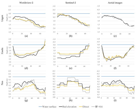 Examples of calculated versus observed depth in selected cross-sections. The horizontal axis is given in meters from the left bank. The columns represent platforms Worldview-2 (a,d,g), Sentinel-2 (b,e,h), and aerial images (c,f,i) for rivers Lågen (a–c), Gaula (d–f), and Nea (g–i). The lines represent the water surface, bed elevation, and depth calculated using the coefficient vectors and , respectively, for the band combination on the Y-axis.