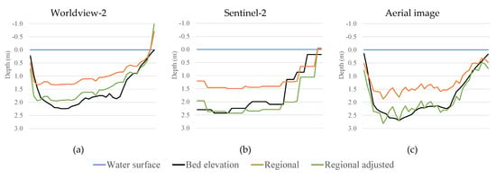 Example of cross-section depth calculations in river Gaula using regional coefficient vectors and for (a) Worldview-2, (b) Sentinel-2, and (c) aerial image. is the basic regional coefficient vector (orange line), while is the regional coefficient vector with adjustment using estimated local average depth and a brightness factor (green line).
