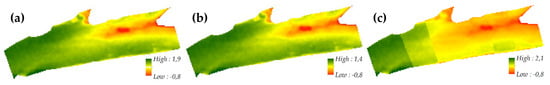 Using the significant relationships between the coefficient vectors, average depth, and brightness, we calculated a depth- and brightness-adjusted for all images, as described in Equations (10) and (11). While no overall significant average depth-relation was found for intercept for platforms Sentinel-2 ( and ) and aerial image (for ), we included the platforms in a final calculation of platform-specific for comparison. An example of regional coefficient vector use in a cross-section is shown in Figure 6. The use of the adjusted coefficient vector improved the results of the basic regional coefficient vector across platforms.
