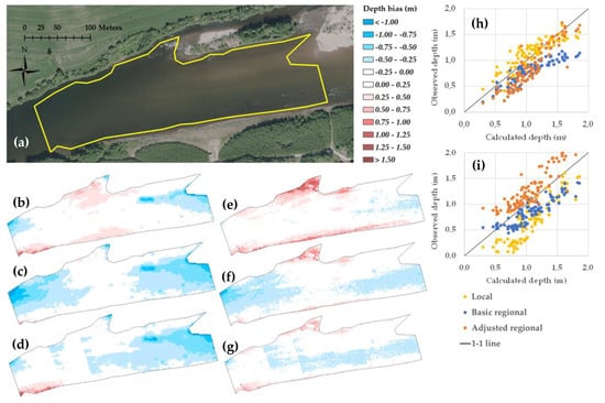 Model performance in river Gaula validation polygon (a). Depth bias maps using local models, basic regional models, and adjusted regional models, respectively, are given for the Worldview-2 image (b–d) and the aerial image (e–g). White indicates a mean error of less than 0.25 m, while red and blue colors indicate an over- and underestimation of depth, respectively. Scatterplots for calculated versus observed depth using the three different models are given for the Worldview-2 image (h) and the aerial image (i).