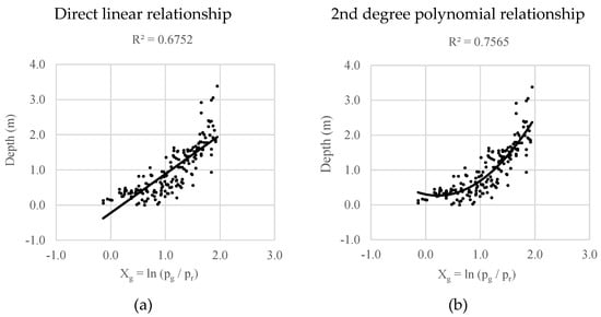 - Using linear regression, we calculated coefficients and for the relationship between , , and depth, as given in Equations (1)–(3).