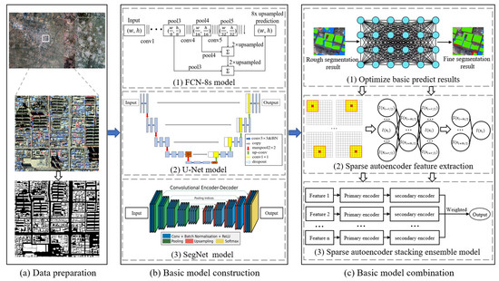 The framework of the proposed ensemble deep learning model for building extraction (denoted as SENet) is presented in Figure 1. The overview of the framework consists of three stages: data preparation, basic model construction, and basic model combination. In the data preparation stage, a building dataset from satellite images was created, and the accuracy of the building features extracted by the model was quantitatively analyzed by adding attribute tags to the buildings in the test set. In the basic model construction stage, three CNN models of U-net, SegNet, and FCN-8s are used to train the model and extract features from the building dataset. Furthermore, a method for optimizing the prediction results of the basic model is proposed based on CRFs. In the basic model combination stage, an ensemble method based on a sparse autoencoder is proposed. First, the sparse autoencoder is used to extract the features of the optimized base model prediction results, and then the stacking ensemble technique is used to integrate the features in a weighted way to obtain the final prediction results. In the following subsections, the methods involved in the construction and combination of the basic predictors are described in detail. The data preparation stage will be introduced in Section 3.1.