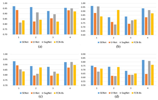 Note that the experimental settings of the networks in this section are the same as those mentioned in Section 3.2. The results of these networks counted on the dataset are shown in Figure 11. From the observation of Figure 10, we can find that the performance of different networks is proportional to the number of basic models. In detail, the behavior of Net 1 is the weakest among all compared networks since it only consists of a basic model SegNet. After integrating two basic models, the performances of Net 2, Net 3, and Net 4 are stronger than that of Net 1. Integrating all three basic models, Net 5 achieves the best performance. Furthermore, the performance gap between Net 5 and other networks is distinct. The results discussed above demonstrate that each basic models can make a positive contribution to our SENet model, and integrating three basic model achieves an incremental improvement over two.