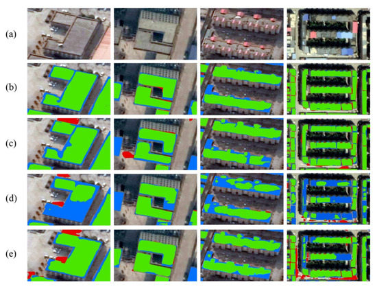 Segmentation results of the different methods for buildings of different shapes. (a) Original input image. (b) The output of SENet. (c) The output of U-Net. (d) The output of SegNet. (e) The output of FCN-8s. The green, red, and blue pixels of the maps represent true positive, false positive and false negative predictions, respectively.