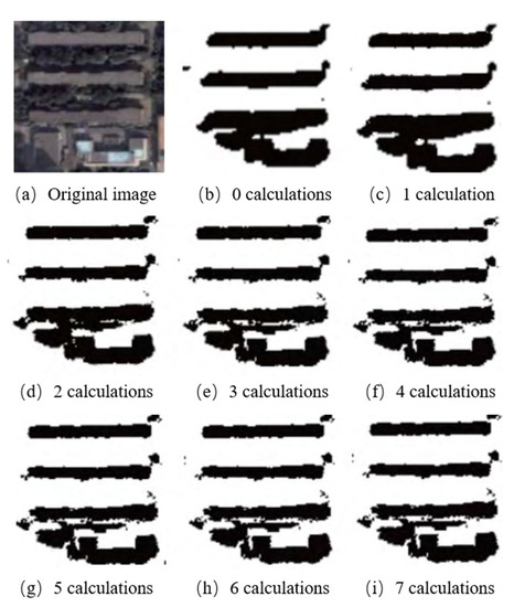 The most important step in the CRF model is to use the inference function to perform inference operations to obtain the value of the energy function. Each additional operation will reduce the energy so that the segmentation results are closer to the color information of the real objects. Although the color information of buildings can be used to improve the edge segmentation effect of buildings, overinference is also likely to increase segmentation result errors due to the interference of color information, resulting in overclassification. To explore the number of inference function estimation calculations required to obtain the optimal segmentation result, experiments with 0–7 calculations were carried out. Taking the segmentation optimization of residential buildings as an example, the effect is shown in Figure 12.