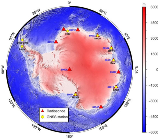 where P is the atmospheric pressure, Pi and Pi+1 are the pressure at the lower and upper layers, respectively (unit: Pa). q refers to the specific humidity (g∙kg−1), ρw denotes the liquid water density (g∙cm−3) and g is the acceleration of gravity (cm∙s−2). The accuracy of PWV estimations derived from radiosonde has been demonstrated to be high with the uncertainty of 5~8% based on different radiosonde types which constantly serve as a standard to confirm other PWV measurement results [11,12]. In this study, the PWV estimations derived from eleven radiosonde sites are considered to assess the reliability of the reanalysis and GNSS PWV results and to derive the Antarctic water vapor variability and trends. For the quality control of radiosonde-derived PWV time series at each station, estimations with deviation from the mean value of estimations outside five times the standard deviation are rejected [36]. The geographical distribution of the eleven radiosonde sites is shown in Figure 1 (red triangles).