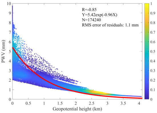 To investigate whether the PWV and its corresponding height would follow the exponential decay equation shown in Equation (5) in Antarctica, the daily ERA5 gridded PWV data in 2018 and corresponding gridded geopotential height data are used to carry out a regression analysis to explore the relationship between PWV and geopotential height over Antarctica. After experiments with MATLAB cftools, we found that the exponential equation could fit well the relation, and the regression analysis result is shown in Figure 2.