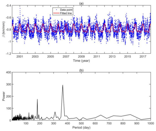 In Figure 2, the regression analysis shows that a significant exponential decay correlation between the PWV and the corresponding height with the correlation coefficient (R) of −0.85, and the exponential decay equation, can fit well PWV versus geopotential height with RMS error of 1.1 mm, indicating that PWV is highly related to elevation in Antarctica, and their relation can be determined as Equation (5). The daily β values are obtained using daily ERA5-derived PWV and the corresponding geopotential height data over Antarctica from 2001 to 2018, and the seasonal variations of the β are investigated. In addition, the fast Fourier transform (FFT) algorithm is performed to detect the characteristic periodicity of β. The results are shown in Figure 3.