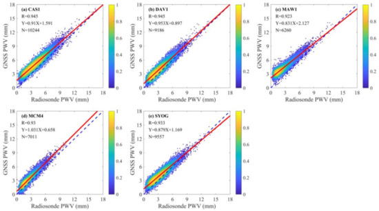 Relative number density plots for PWV from radiosondes and GNSS at the five collocated sites during 2001–2018: (a) CAS1, (b) DAV1, (c) MAW1, (d) MCM4 and (e) SYOG. The color scale indicates the relative density of points.