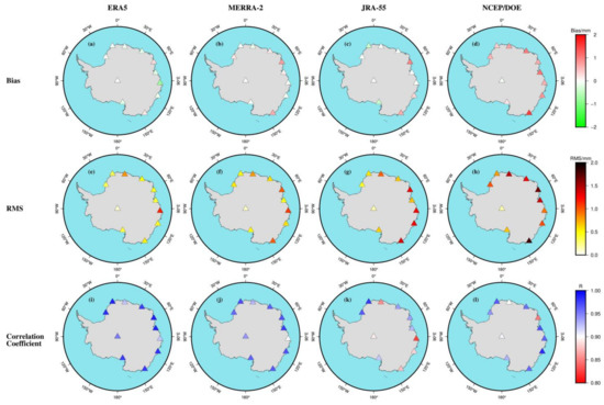 For an each-year comparison, Figure 7 presents the variations of bias and RMS error with year. In the comparison between radiosonde and reanalysis data, the biases and RMS errors of four reanalyses are small and steady without large fluctuations, except for JRA-55 which has a sudden increase in RMS errors from 2017 to 2018. The RMS errors of JRA-55 in 2017–2018 are nearly 1 mm larger than those of the other years, which are caused by the large differences between JRA-55 and radiosonde observations at several radiosonde stations. This issue in JRA-55 requires to be further investigated once more in situ observations are available in Antarctica. Compared with radiosonde, the biases and RMS errors have larger fluctuations in the comparison between GNSS and reanalysis data. Such issues may be caused by the changes in GNSS equipment (such as the receiver type, and the antenna brand and model) and the varying processing strategies (such as the software, and the mapping function and input parameter) in IGS ZTD product over time [59]. Even so, the fluctuations are not large, with RMS values fluctuating around 0.5 mm. It is noteworthy that the higher the spatial resolution of reanalyses is, the higher the accuracy of reanalyses is. This can be explicable by the fact that the better performance of the reanalysis models is attributed not only to the spatial resolution, but also to underlying better physical models and assimilation methods [24,51].
