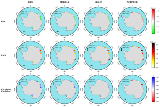 In the evaluation with respect to radiosonde, ERA5 gets the highest accuracy with respect to MERRA-2, JRA-55 and NCEP/DOE with mean bias, RMS, relative RMS and R values of −0.1 mm, 0.5 mm, 15.45% and 0.97, respectively. However, NCEP/DOE shows a worse accuracy than the other three reanalyses with mean bias, RMS, relative RMS and R values of 0.69 mm, 1.11 mm, 34.88% and 0.95, respectively. The R values between the reanalysis-derived PWV and radiosonde-derived PWV for eleven stations vary between 1 and 0.8, which indicates that the PWVs derived from reanalysis and radiosonde have strong correlations at these sites. As shown in Figure 5, compared with radiosonde, the R values of ERA5 and MERRA-2 are slightly higher than JRA-55 and NCEP/DOE among the radiosonde stations (see Figure 5i–l). Positive biases are observed in most sites except for ERA5, which are nearly 0 mm level. The RMS errors of the four reanalyses are all below 2 mm at all 11 radiosonde stations, and ERA5 shows a best performance with respect to other reanalyses, while NCEP/DOE performs the worst. All reanalyses seem to have low biases and RMS errors; however, NCEP/DOE has a larger relative RMS error of 34.88%. It is better to refer to relative RMS errors instead of considering biases and RMS errors only, especially in Antarctica where the PWV contents are very low. The sites with larger RMS errors in the four reanalyses are mainly located in coastal East Antarctica; the water vapor and its uncertainty are relatively large under the influence of the ocean.