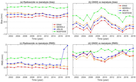 The (a,b) biases and (c,d) RMS errors of PWV differences between (left) radiosonde and four reanalyses, and (right) GNSS and four reanalyses for each year from 2001 to 2018.