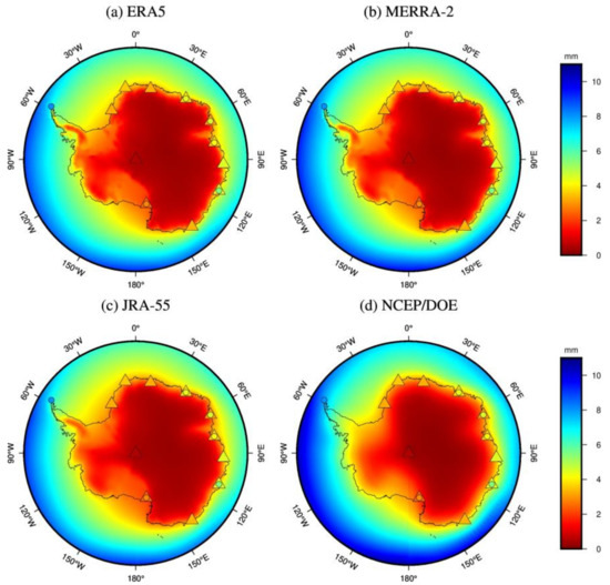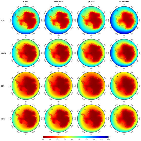 For seasonal PWV means, all the reanalyses reasonably reproduce the mean PWV spatial distributions revealed by the radiosonde and GNSS observations as shown in Figure 10, with most of MAD values below 1 mm during the four seasons (see Table 4). In addition, the patterns of seasonal means between the four reanalyses are also generally similar. The mean PWV is 0−12 mm over Antarctica with small seasonal variations during the four seasons. In DJF (summer), the PWV content is higher than in other seasons, whereas it is lowest in JJA (winter). This phenomenon results from the fact that most Antarctic regions enjoy the polar day in summer and the round-the-clock sunlight increases the temperature and the water vapor pressure and accelerates the hydrological cycle and melting of surface snow and sea ice, causing an increase in water vapor. In winter, most Antarctic regions are in the polar night, and the low temperature decreases the surface evaporation and water vapor content [22]. In addition, the interseasonal variation of PWV content in East Antarctica is small. Larger PWV interseasonal variations are mainly reproduced in West Antarctica and the peripheral sea. This is mainly due to the extremely cold and dry atmosphere in East Antarctica, where the altitude is relatively high.