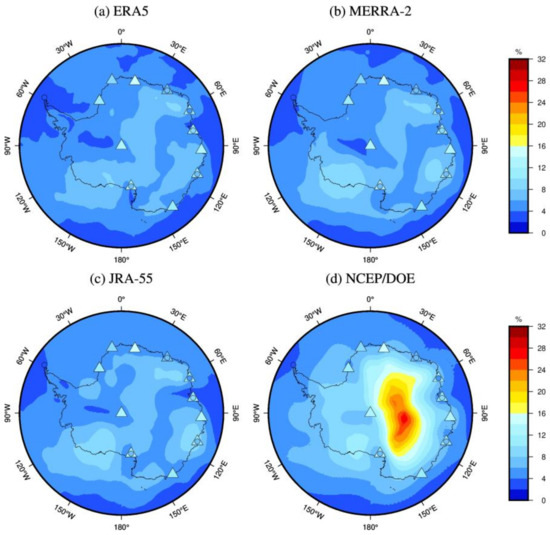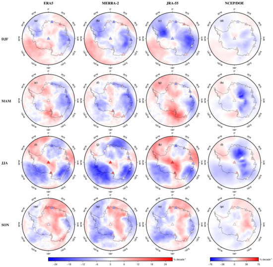Table 6 confirms that the PWV trends estimated from ERA5 and MERRA-2 generally agree better with radiosonde and GNSS than JRA-55 and NCEP/DOE over Antarctica. In addition, ERA5 performs best with average MADs of 1.94% decade−1 and 4.68% decade−1 verified by radiosonde and GNSS, respectively, whereas NCEP/DOE performs worst with average MADs of 2.69% decade−1 and 6.17% decade−1, respectively. Compared with radiosonde, the MADs of all four reanalyses for relative PWV trends are largest in DJF (summer), with values of 2.63%, 3.05%, 3.09% and 3.43% per decade for ERA5, MERRA-2, JRA-55 and NCEP/DOE, respectively. When compared with GNSS, the largest MADs are detected in JJA (winter): 8.31%, 8.49%, 9.11% and 9.59% per decade for ERA5, MERRA-2, JRA-55 and NCEP/DOE, respectively, which are about three times larger than those of radiosonde data. Such a seasonal discrepancy between radiosonde and GNSS may be related to how the performance of different equipment varies in different seasons, or changes in equipment. Moreover, the artificial errors of pressure provided by ERA5 introduced in GNSS PWV retrieval are relatively large in winter because of the poorer accuracy of pressure in winter with respect to summer for ERA5 [36].