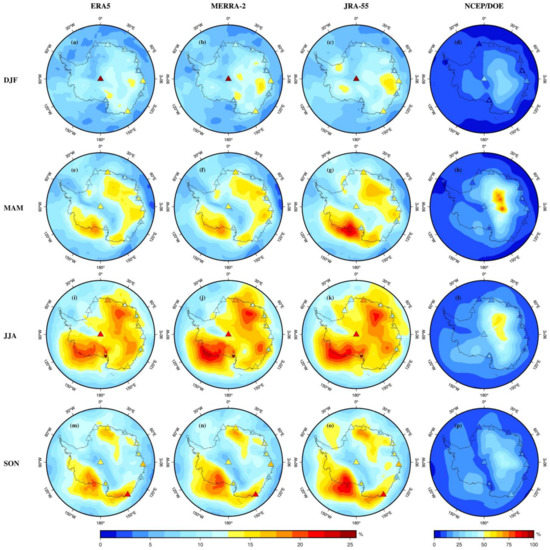 PWV relative variability over Antarctica derived from (a,e,i,m) ERA5, (b,f,j,n) MERRA-2, (c,g,k,o) JRA-55, (d,h,l,p) NCEP/DOE reanalysis (color shading), GNSS (color circles) and radiosonde (color triangles) for the four seasons from 2001 to 2018.