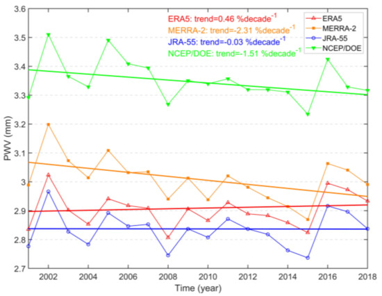 where yj and yi are the monthly PWV anomaly values at time tj and ti (j > i), respectively. The monthly PWV anomalies are obtained by removing the monthly PWV climatology (mean value of monthly PWV over the whole period from 2001 to 2018) from the monthly PWV. To understand the PWV change intuitively, the percentage trend Ptrend (unit: % decade−1) is used in this work [54]: