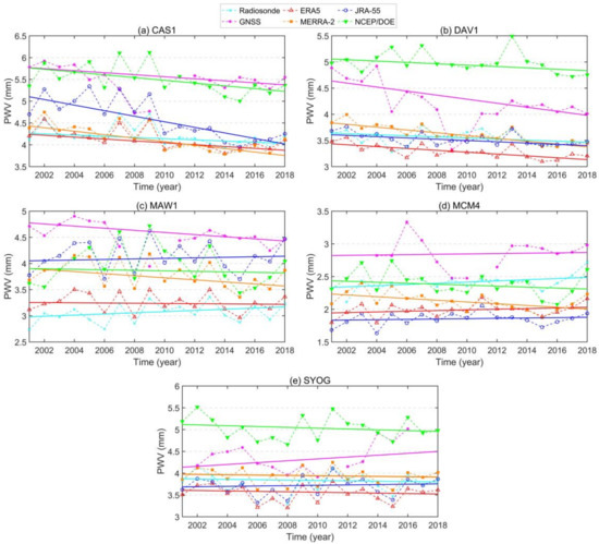 Figure 12 shows the time series of ERA5, MERRA-2, JRA-55 and NCEP/DOE annual PWV averaged over Antarctica from 2001–2018. In addition, the time series averaged from radiosonde, GNSS and the four reanalyses data at the five collocated sites (see Figure 1) are shown in Figure 13, and their relative PWV linear trends, expressed as percentages, are listed in Table 5.