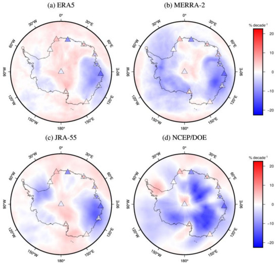 The spatial distributions of relative PWV linear trends for both reanalyses are shown in Figure 14. Figure 14 illustrates that increasing PWV trends are observed near the South Pole in both reanalyses, whereas downward trends are observed over the Wilkes Land and Ellsworth Land. Among the reanalyses, MERRA-2, JRA-55 and NCEP/DOE generally have overall negative trends in most Antarctic regions, while ERA5 generally shows an overall positive trend. Moreover, MERRA-2 and NCEP/DOE show stronger trends than ERA5 and JRA-55.