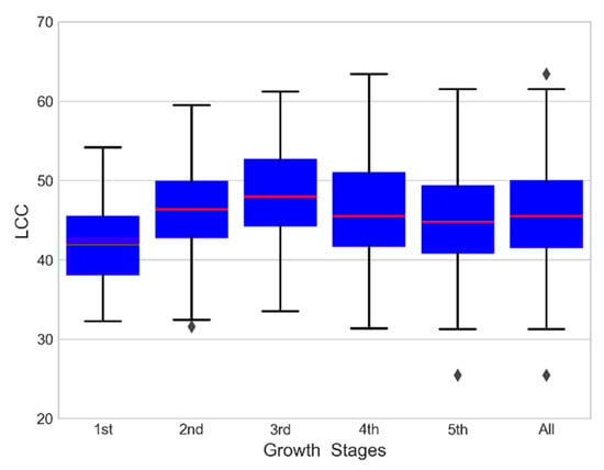 The range of LCC was 25.45 to 63.40, as shown in Table 3. The LCC increased in young expanding leaves, reached the highest value at maturity, and then decreased significantly during senescence. The measured LCC increased gradually from the 1st growth stage to the 3rd growth stage and decreased to a minimum at the 5th growth stage (Figure 2).