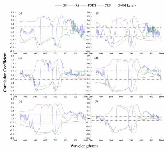 Correlation coefficients between LCC and spectral transformation at the different growth stages. (a) 1st growth stage; (b) 2nd growth stage; (c) 3rd growth stage; (d) 4th growth stage; (e) 5th growth stage; (f) All growth stages. OS: original spectrum; RS: reciprocal transformed spectrum; FODS: first−order differential spectrum; CRS: continuum removal spectrum.